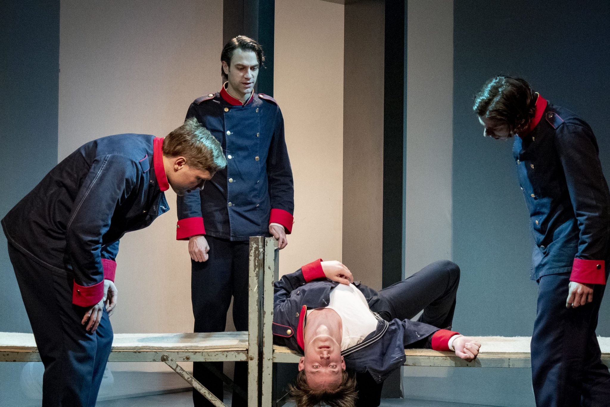 In Deutschland ist es genau diese Denkart, die den Menschen einen „Platz an der Sonne“ verspricht. Das Bühnenbild scheint in seinem Aufbau der Dachkammer eines Instituts nachempfunden zu sein und holt aus der kleinen Bühne viel heraus. Virtuos bewegen sich die Schauspieler Fabian Oehl (Törless), Justus Verdenhalven (Reiting), Anthony Paul (Beineberg) und Marco Litta (Basini) auf, über und zwischen den Pritschen, die im Vordergrund der Bühne an den Schlafsaal der Zöglinge erinnern.