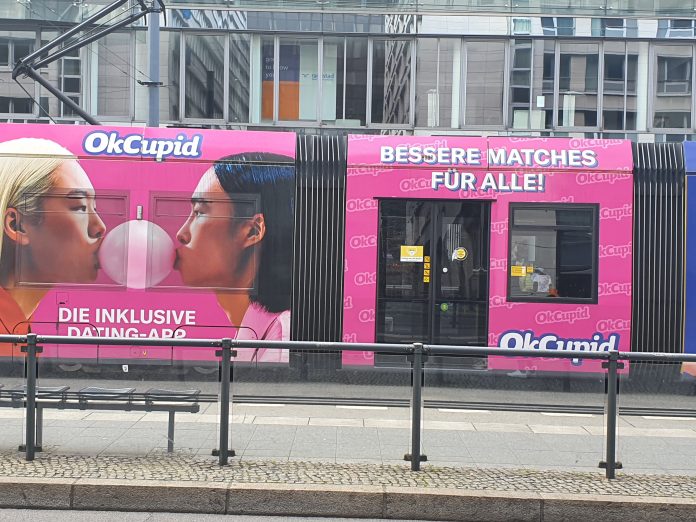 Und dann gibt es noch OkCupid, eine Plattform die mit Slogans wie „bessere Matches für alle!“ wirbt. Die Plattform wirbt für sich als progressive App. „Date jemanden, der*die genauso progressiv ist wie du!“, steht auf einem großen Plakat im U-Bahnhof Zoologischer Garten.