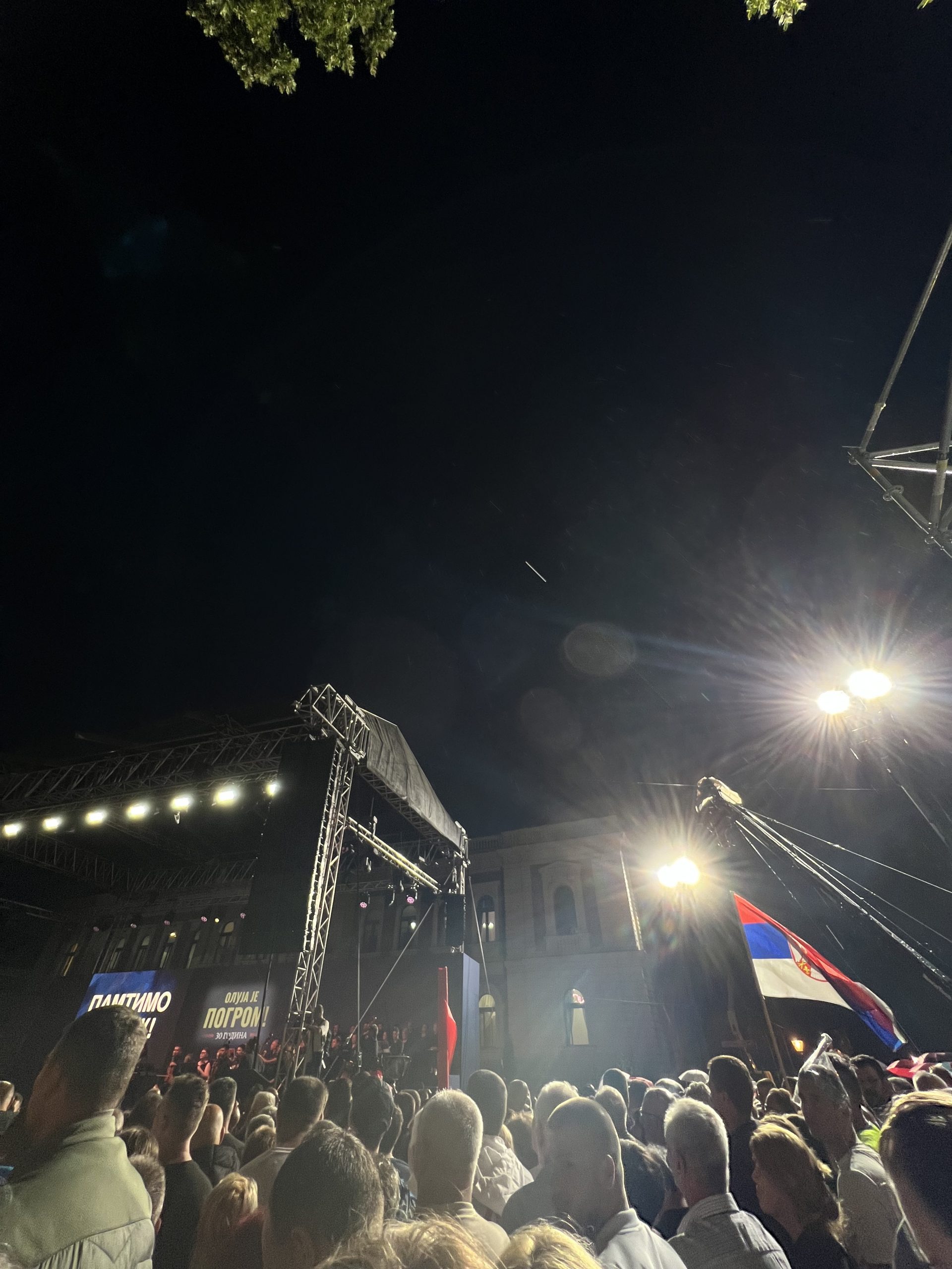 Bevor wir weiter zusammengedrückt werden, bahnen wir uns den Weg, weg von der Bühne in den benachbarten Park, von wo aus wir die Rede des serbischen Präsidenten Aleksandar Vučić verfolgen. Bevor Vučić zu reden beginnt, erschallen laute „Kosovo je Srbija“-Sprechchöre. Die Frage, ob Kosovo zu Serbien gehört, hat zwar nichts mit der Operation Oluja zu tun, drückt aber ebenso wie die Trauer um die Krajina großserbische Fantasien im Publikum aus. Vor der Bühne schwenken Anhänger*innen des Präsidenten Fahnen mit seinem Konterfei. Die Frankfurter Rundschau zitiert Vučić mit folgenden Worten: „Wir werden nie wieder zulassen, dass ihr die Freiheit eines Serben in irgendeiner Weise bedroht.“ Eine Aussage, die sich auf die Verurteilung Dodiks in Bosnien-Herzegowina bezieht. Vučić betonte, dass die internationale Gemeinschaft Serbien seit den Jugoslawienkriegen ungerecht behandle und er es nicht zulassen werde, dass Serbien zum Diener ausländischer Mächte wird.