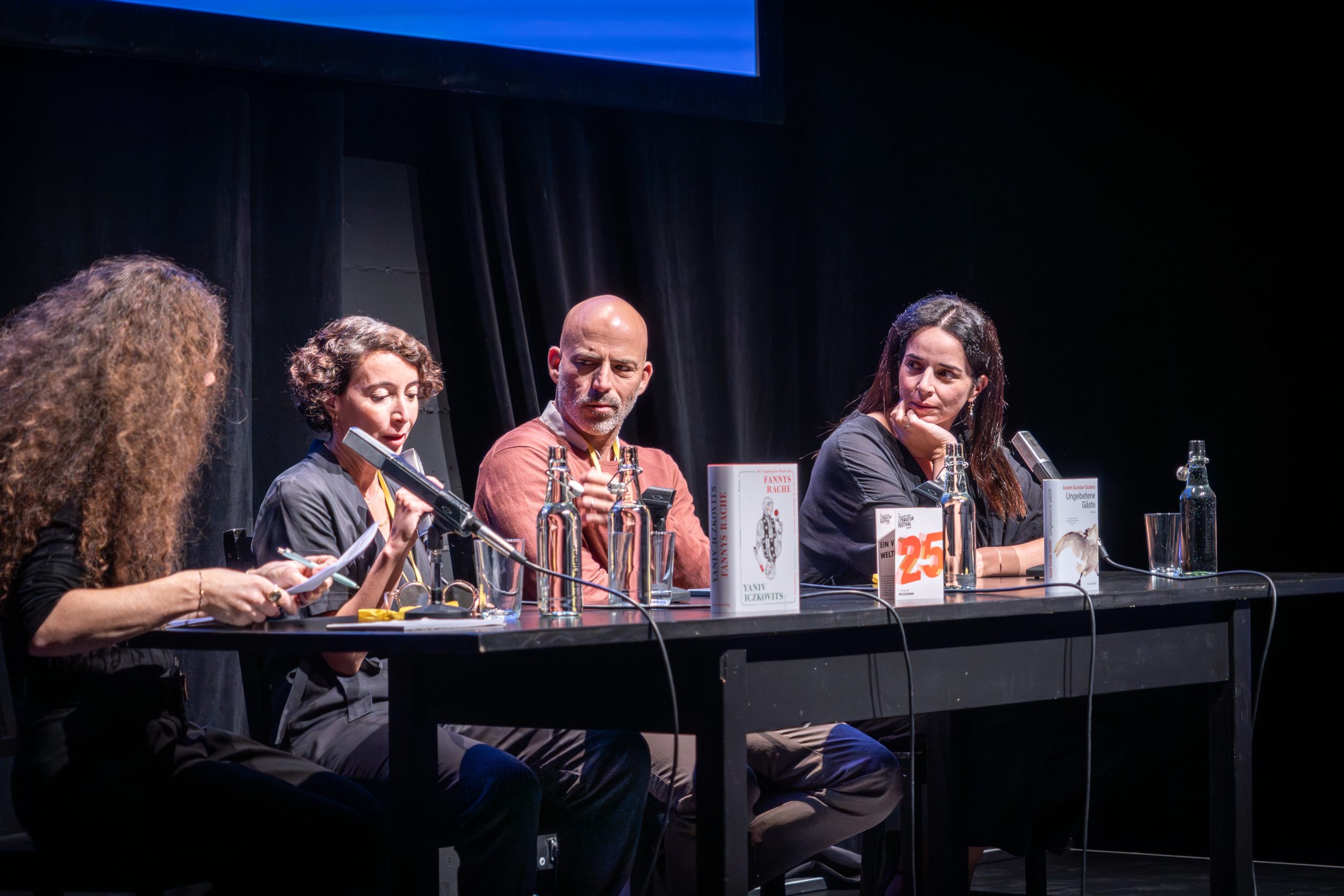 Die Reihen werden voller, bis sich plötzlich das Licht verdunkelt. Was bleibt, sind seichte, auf die Bühne ausgerichtete Scheinwerferstrahlen. Lavinia Frey, die Direktorin des Festivals, betritt die Bühne, begrüßt das Publikum und leitet die Veranstaltung „Schreiben nach dem 07. Oktober“ ein. Sie erzählt, dass die Idee aus einem Gespräch mit der künstlerischen Leiterin des Jerusalem International Writers Festival, Julia F. Tzaisler, entstanden sei. Tzaisler ist sowohl Autorin als auch Rednerin der heutigen Veranstaltung. Gemeinsam mit der Autorin Ayelet Gundar-Goshen, dem Autor Yaniv Iczkovits sowie der Moderatorin Shelly Kupferberg betritt sie die Bühne.