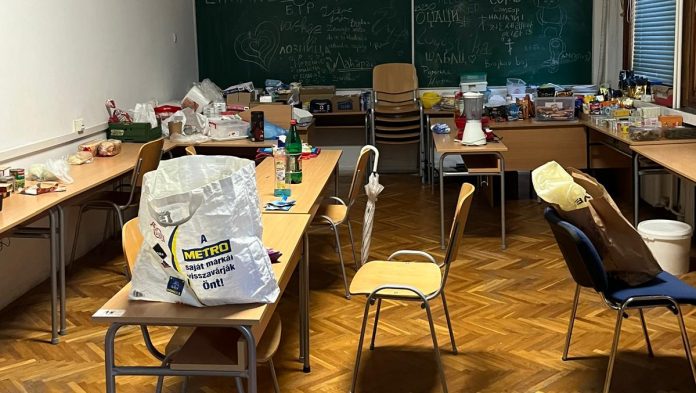 Wir betreten mit Nikola das Gebäude der wissenschaftlichen Fakultät. Im Foyer werden wir freundlich von den Student*innen empfangen. Hier liegen Flyer, Sticker und Poster mit Werbung und Informationen über die Proteste. Zwei Studentinnen sitzen an einer Art Empfang und notieren unsere Namen und Matrikelnummern. Doch das hier ist nicht nur ein Ort der politischen Organisation, es ist auch ein Ort zum Schlafen, zum Essen und ein Ort der Gemeinschaft. Nachdem unsere Daten notiert wurden, darf Nikola uns das ganze Gebäude von innen zeigen. Die Räume der besetzten Universität wirken wie ein großes, ungemachtes Bett, aus dem jemand frühmorgens aufgesprungen ist, um sich gleich wieder an die Arbeit zu machen. In den Hörsälen und Klassenzimmern liegen Matratzen, Schlafsäcke und Decken auf dem Boden. Ein Klassenraum wurde zu einer Küche umfunktioniert und gespendete Lebensmittel stehen ausgebreitet auf den Tischen. Im Eingangsfoyer sitzen Menschen, die miteinander reden und essen. Uns wird langsam bewusst: Das ist keine zeitweilige Besetzung eines Gebäudes, wie wir sie von Protesten an Berliner Universitäten kennen. Es ist ein Lebensmittelpunkt für die Student*innen.