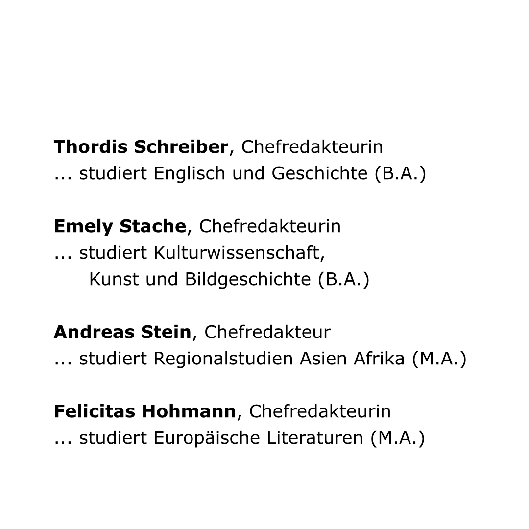 Die Chefredaktion teilt unter sich die verschiedenen Aufgaben – Heft- und Projektplanung sowie Online und Social Media – auf, so ist beispielsweise immer eine andere Person Chef oder Chefin vom Dienst. Dazu kommen noch andere Aufgaben, wie die Koordination mit dem Vorstand oder die Übersicht über den Planungs- und Redigierprozess.